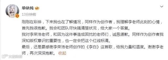随后,@李荣浩 发文回应@单依纯 道歉: