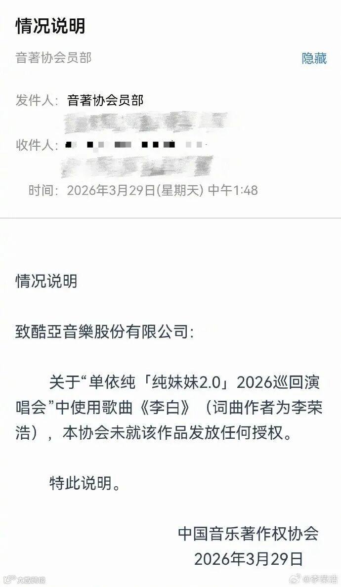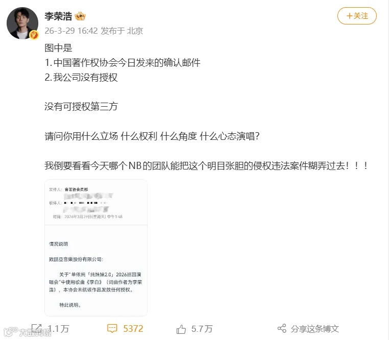 3月29日,李荣浩发长文公开指控单依纯在深圳演唱会未经授权翻唱其代表作《李白》,引发版权侵权争议,并质问其行为动机与改编诚意。