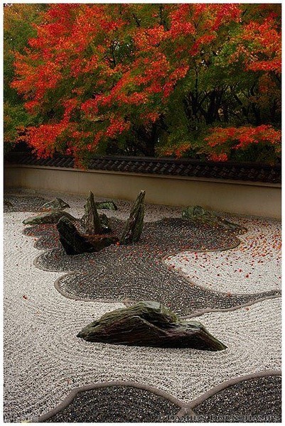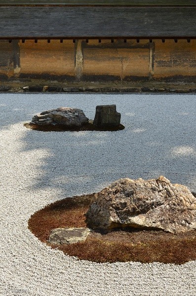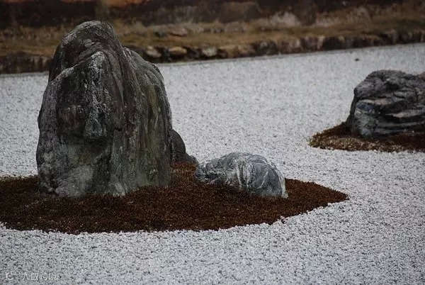 在这样的庭院中,我们见不到碧水细流,只有白砂与石头的各种组合,从中人们可以感受到海、岛屿,还有云海、孤峰,小桥、流水。