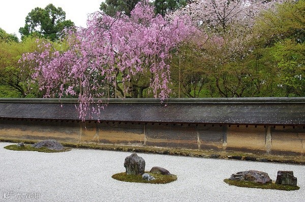 春天的龙安寺枯山水庭樱树婆娑,花枝入墙。围起石庭的矮墙由土砌成, 为禅意的体现, 土墙的泥混有菜籽油,时间久了慢慢渗出,形成独特的纹理, 似乎颇有历史的厚重和现世的美好。
