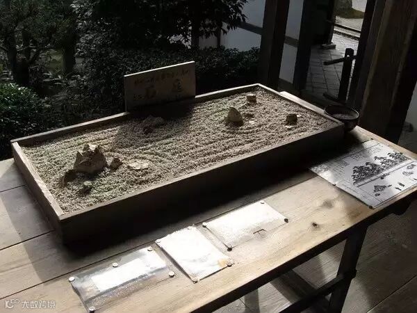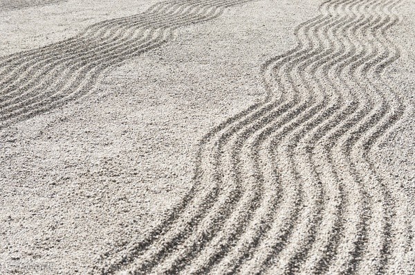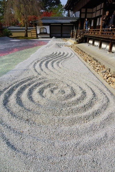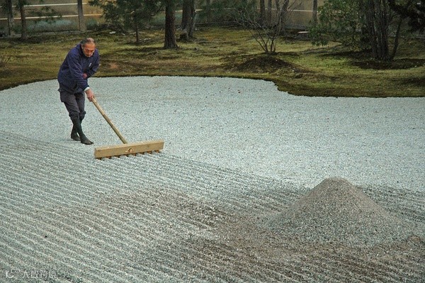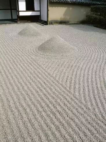 在白沙上绘出几何图案,是禅寺每日清晨的工作,这种沙纹,其实代表着水。在白沙上描绘出沙纹,看起来像河或像大海,再或者又好似云海, 映射出每个人的内心世界,这就是枯山水,无水,却让人感觉到水,这种表现方法就是枯山水的特点。