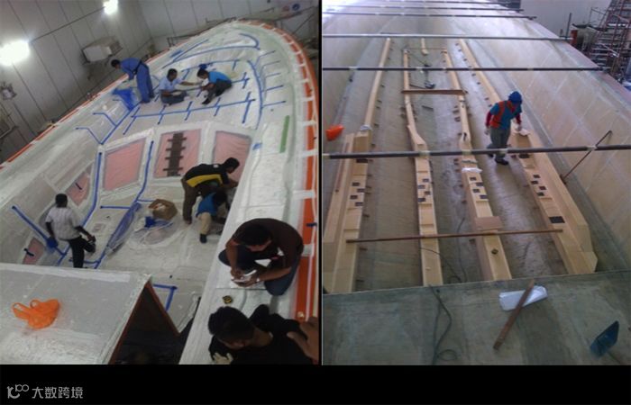 钢质渔船、木质渔船是采用钢材、木材经过切割、加工、焊接、螺栓紧固而成, 而玻璃钢渔船是用玻璃纤维和树脂在模具上固化而成为整体,其优点是整体成型,建造周期短,能根据使用要求 设计复杂线,方便做出任何特殊形状 (如球形首、 球尾 ) ,这对木船来说几乎不可能。