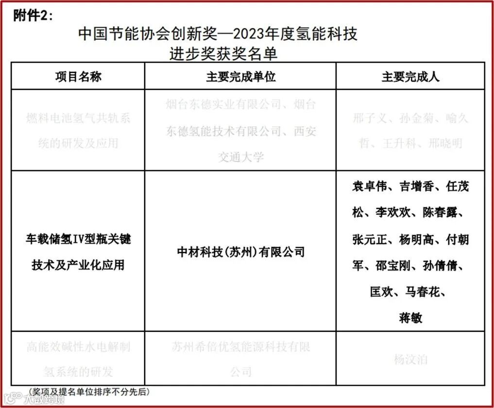 近日,中国节能协会对2023年度氢能企业贡献奖和科技进步奖获奖名单进行了公示,苏州有限“车载储氢IV型瓶关键技术及产业化应用”荣获“中国节能协会创新奖-2023年度氢能科技进步奖”殊荣。荣获该奖项是对苏州有限创新能力的充分肯定,标志着公司车载储氢IV型瓶领域的技术实力达到行业领先水平,对引领我国Ⅳ型储氢瓶技术发展,推动燃料电池汽车商业化进程具有重要的意义。
