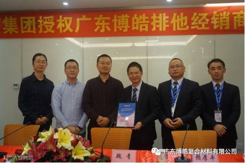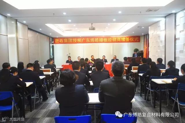 2016年12月12日,中国巨石授权广东博皓排他经销商续签仪式在博皓天安会议室隆重举行。中国巨石国内销售总经理魏青、国内销售部华南区部长纪汕平、大客户部部长董月姣等人与博皓董事长赖厚平、总经理尹秀林出席了本次仪式,参加活动的还有博皓家人们,大家齐聚一堂共同见证这个具有历史意义的光荣时刻。仪式由广东博皓销售副总赖道理主持。