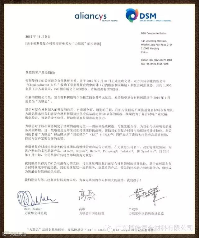 关于帝斯曼复合材料树脂即将更名为力联思的沟通函(中文版)----帝斯曼公司提供