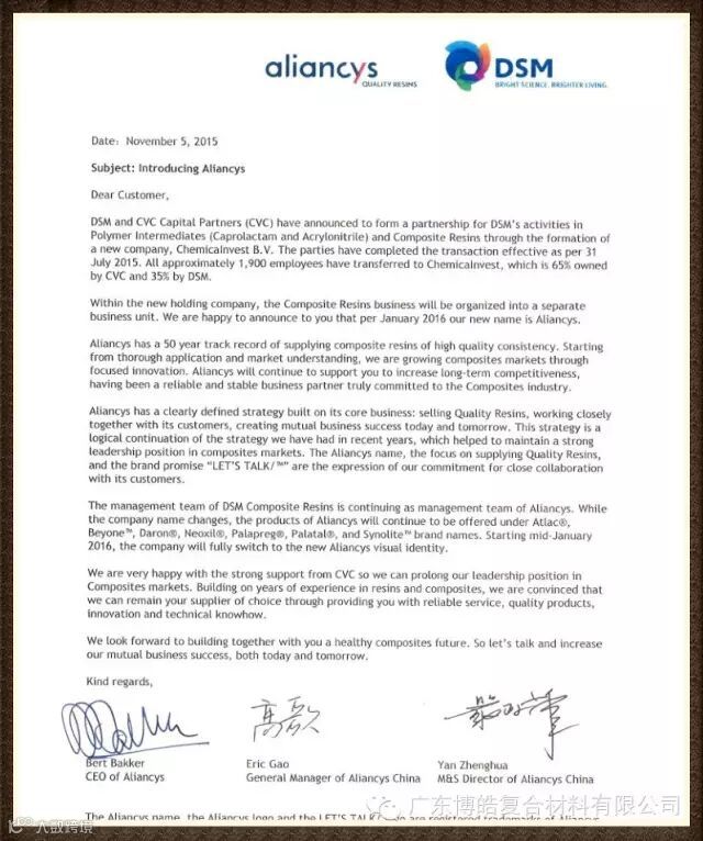 关于帝斯曼复合材料树脂即将更名为力联思的沟通函(英文版)----帝斯曼公司提供