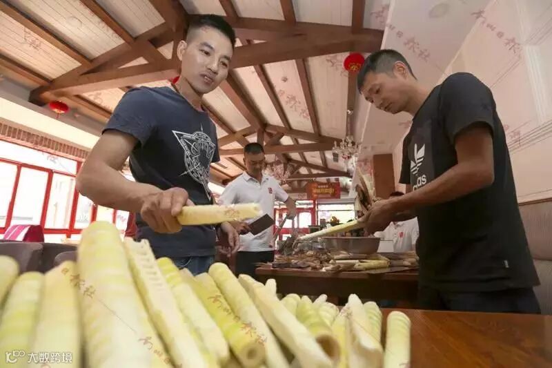 (当前正值金佛山采笋季,一同前往的自然少不了堪称“世界一绝 ”的金佛山方竹笋。在录制棚边的小屋子里,厨师赵亮正在精心准备)