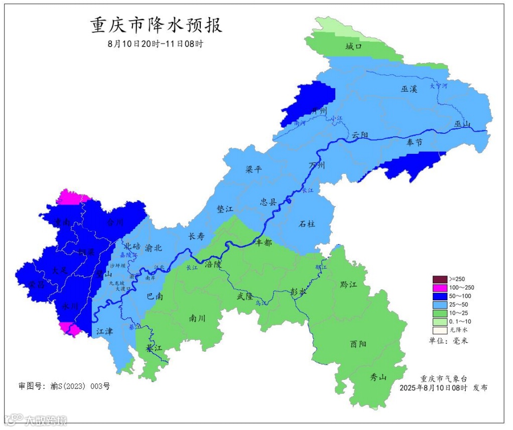 8月10日夜间,重庆西部和东北部地区大到暴雨(30~80毫米),局地大暴雨(100~150毫米),其余地区中到大雨,局地伴有7~9级阵性大风和雷电,气温23~37℃;中心城区大雨(25~45毫米),气温29~36℃。