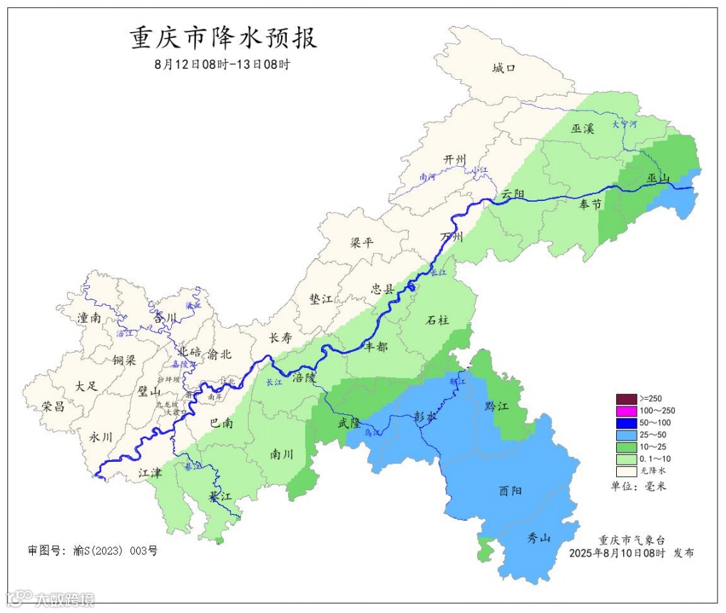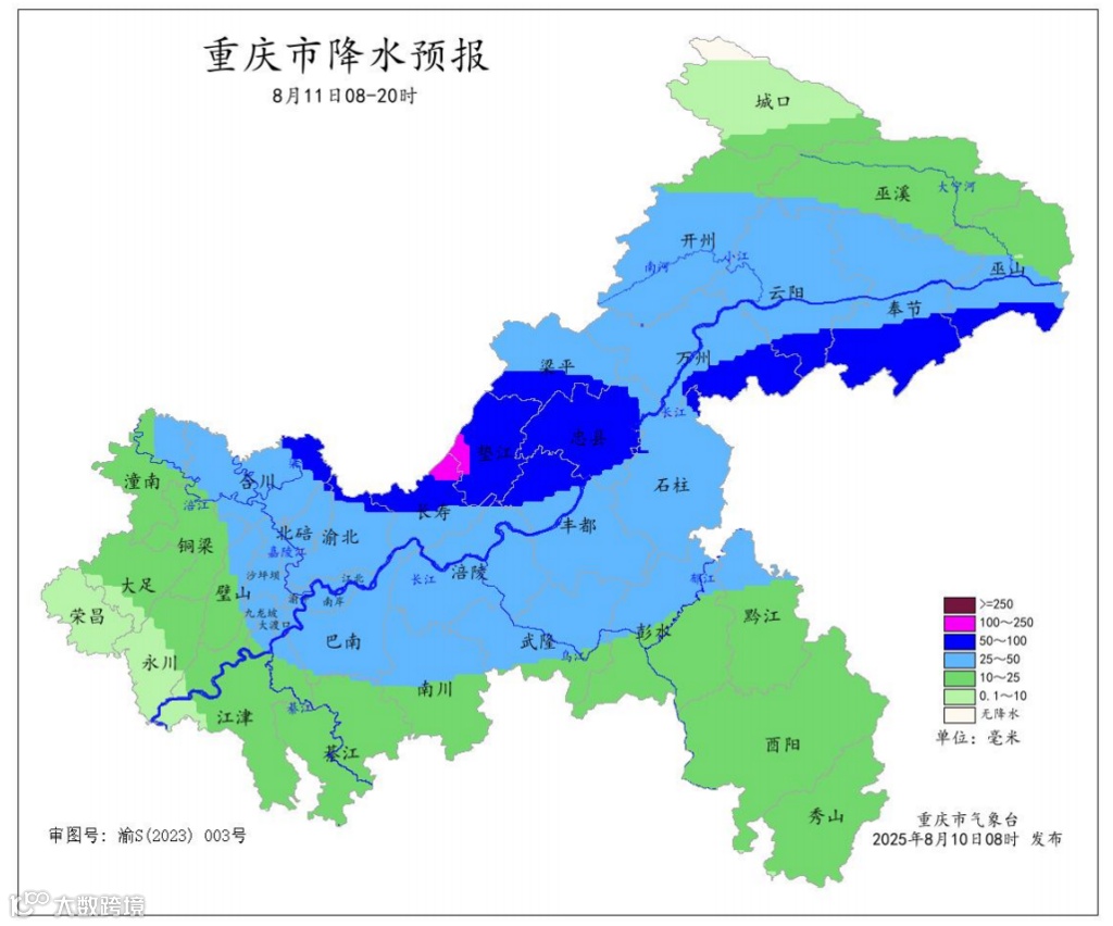 8月10日,重庆市气象台发布气象要讯,预计10日夜间到12日白天,我市东北部、中西部大部地区和东南部的石柱、黔江、彭水有暴雨到大暴雨局地特大暴雨,降水具有极端性,主要影响时段为11日凌晨到夜间,雷雨时局地伴有7~9级阵性大风。详情如下: