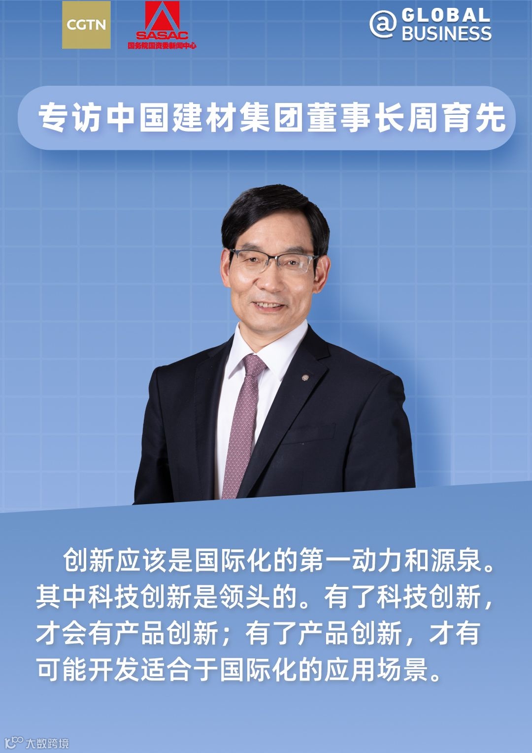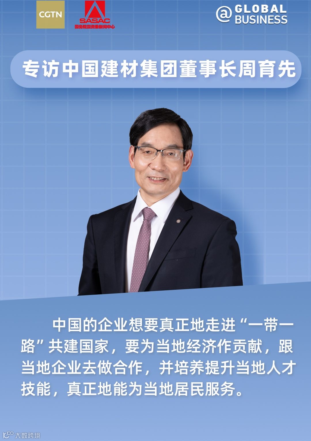 “一带一路”倡议提出十周年之际,国务院国资委新闻中心联合中国国际电视台(CGTN)策划年度重点访谈节目《丝路新国企》,共话中央企业十年间在海外的融合与发展。10月17日,“一带一路”国际合作高峰论坛期间,CGTN新媒体平台和电视台先后播出了与中国建材集团党委书记、董事长周育先的专访,下面跟随小料一起看看吧~