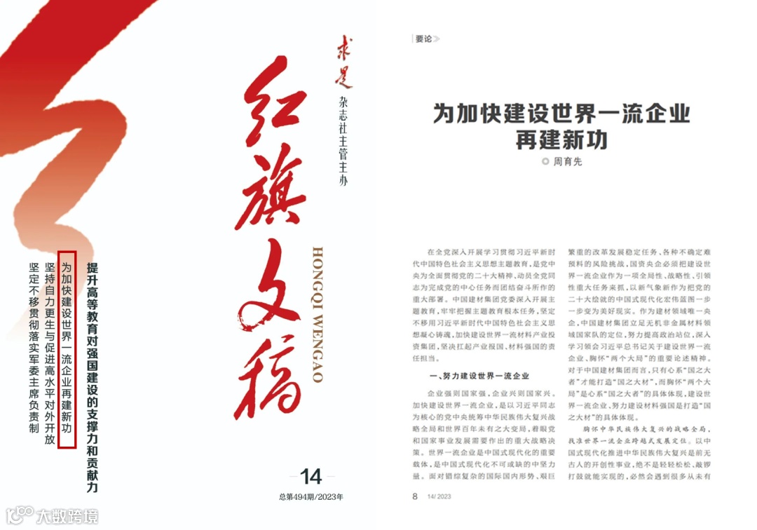 2022年8月16日《求是》刊发了中国建材集团党委书记、董事长周育先署名文章《坚持创新驱动 建设材料强国》(点击文字查看原文),时隔不到一年,2023年7月25日由求是杂志社主管主办的《红旗文稿》刊发周育先署名文章《为加快建设世界一流企业再建新功》,展现了中国建材集团扎实开展主题教育,心怀“国之大者”,打造“国之大材”,积极助力建设材料强国的新成效,体现了国资央企“顶梁柱”“压舱石”的责任与担当。