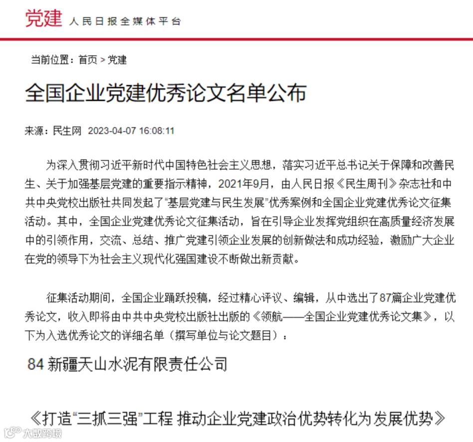 06 新疆天山水泥公司党建论文获评“全国企业党建优秀论文”