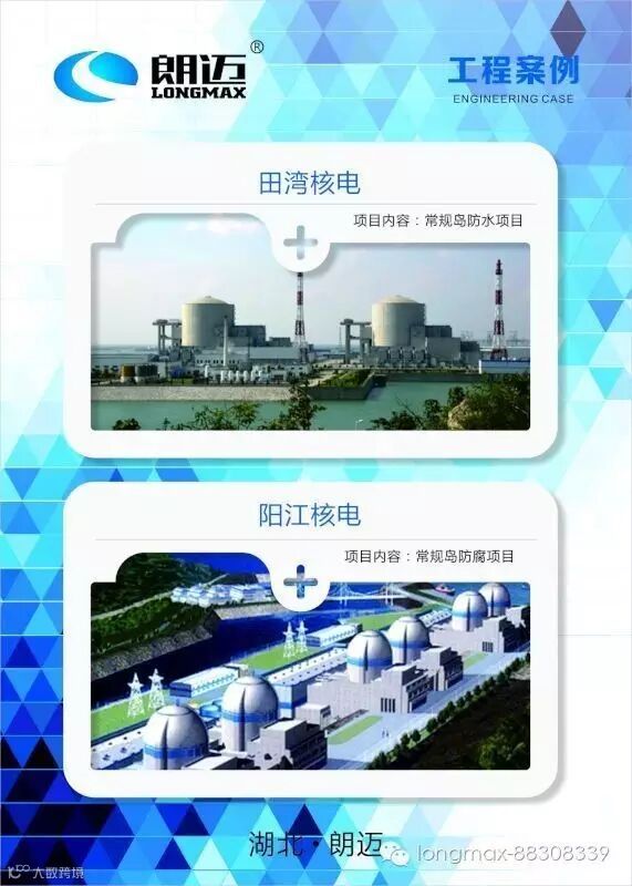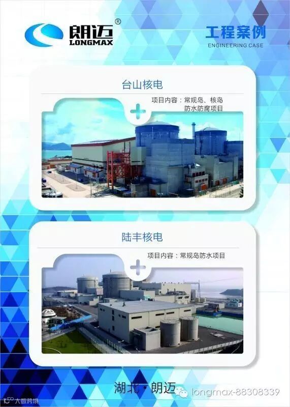 早在2006年,朗迈股份公司就已通过了核工程认证,与广东岭澳核电站签订了防水、防腐材料供应合同。此后朗迈公司积极参与国内核电建设,先后与广东阳江核电站、台山核电站、江苏田湾核电站、海南昌江核电站签订产品配套供应协议。朗迈防水、防腐一系列产品在核电站核岛、常规岛等工程建设上得到了广泛应用,获得诸多业主的一致好评。