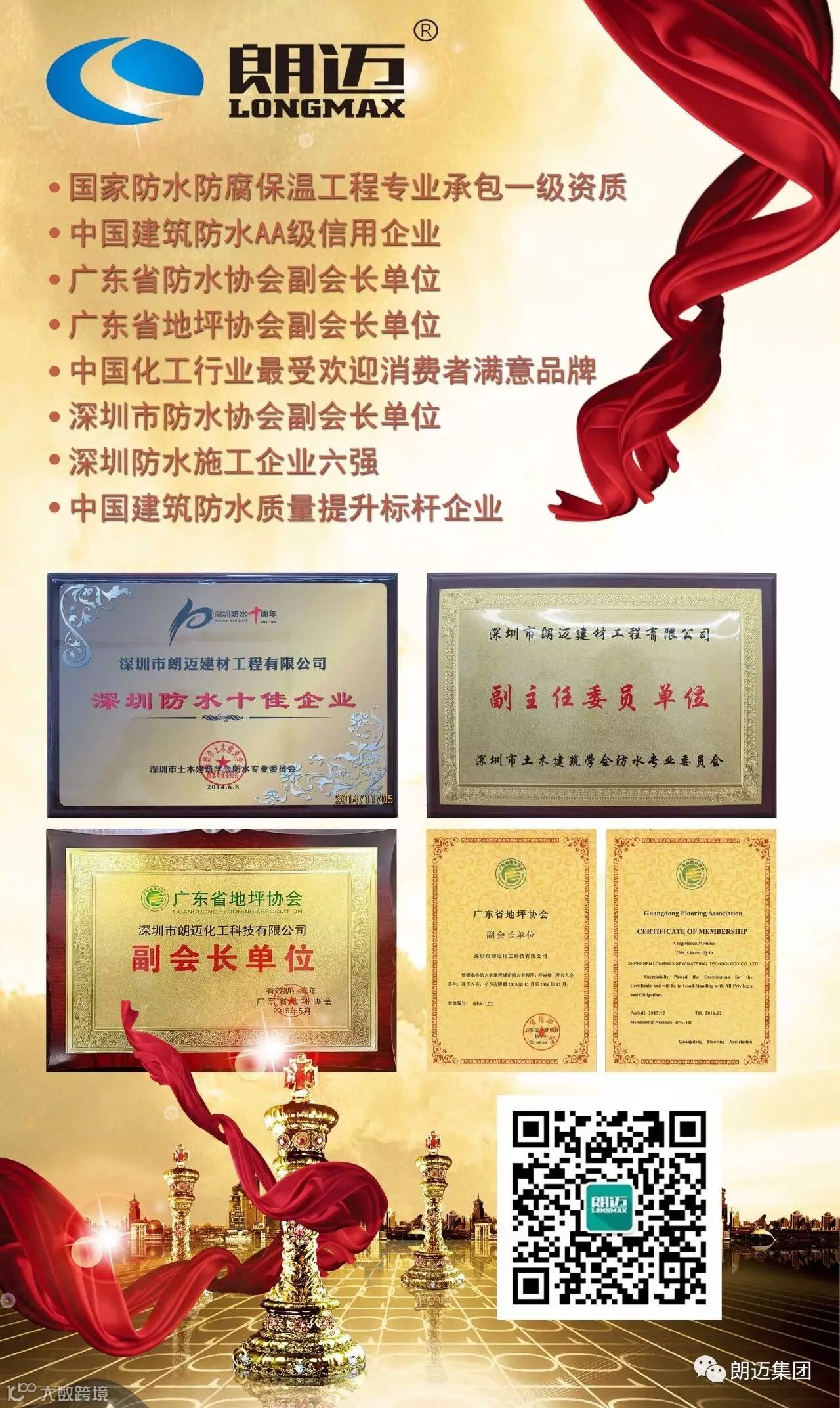 2017年1月,深圳市防水行业协会成立答谢会暨2016总结大会在深圳福田区北海渔村隆重召开,朗迈公司在会上获得了“突出贡献奖”。这些称号代表的不仅是企业或个人荣誉,更是朗迈公司在长时间发展中所沉淀的社会公信力与美誉度,以及业界同行对朗迈业界地位的高度认可。