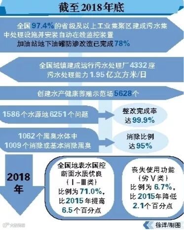 截至2018年底,全国97.4%的省级及以上工业集聚区建成污水集中处理设施并安装自动在线监控装置。加油站地下油罐防渗改造已完成78%。拆除老旧运输海船1000万总吨以上,拆解改造内河船舶4.25万艘。全国城镇建成运行污水处理厂4332座,污水处理能力1.95亿立方米/日。累计关闭或搬迁禁养区内畜禽养殖场(小区)26.2万多个,创建水产健康养殖示范场5628个。开展农村环境综合整治的村庄累计达到16.3万个,浙江“千村示范、万村整治”荣获2018年联合国地球卫士奖。