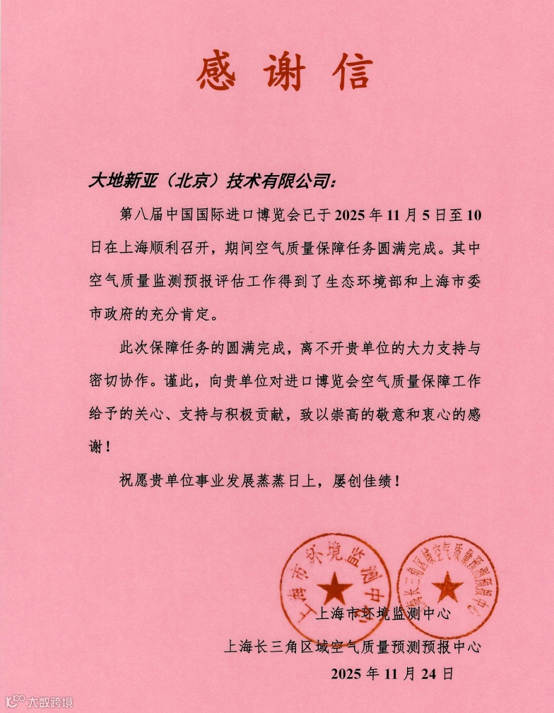 这份保障底气,源于天象新亚长期积淀的技术实力与深度协作的坚实基础。公司与生态环境部长三角区域预报中心保持长期深度合作,在建党 100 周年、历届进博会等重大任务保障工作中,已形成覆盖 “立体监测 - 多源数据调度” 的全流程技术能力。公司持续扩大区域立体气象观测服务范围,预报数据产品已纳入上海市环境监测中心常态化应用体系,为进博会 “零碳办博” 提供专业量化支撑;更凭借稳定可靠的服务,连续七年荣获上海市环境监测中心及生态环境部长三角区域预报中心的感谢信。
