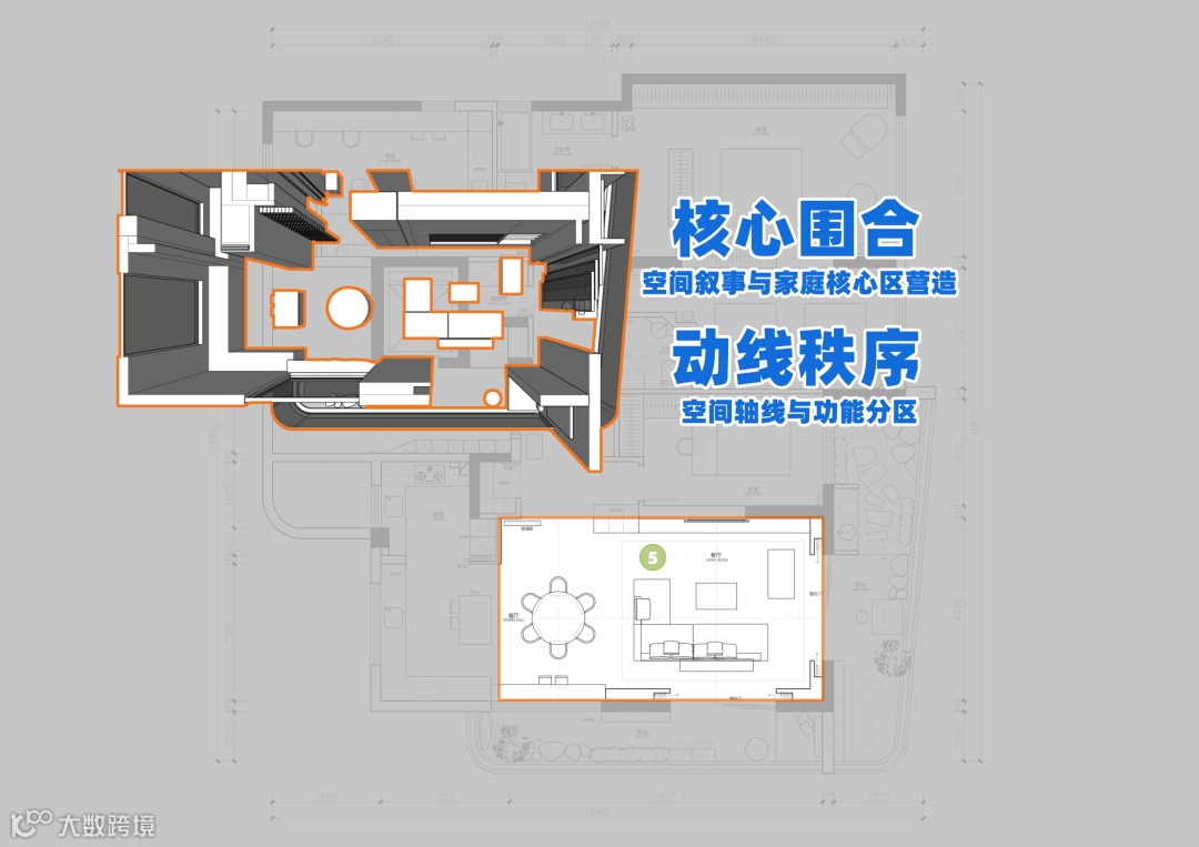 解析5▶客厅选用 L 型沙发,围合出舒适的居家核心区;电视墙依托整面最大立面打造,整体大气、视觉统一。餐桌与吧台有序排布,让客餐厅形成清晰的中心轴线,与阳台保持高度通透,天光与绿意自然延伸。空间动线规划流畅回游,功能分区明确,兼顾三代人日常起居、休闲互动与行走便利,在实用之上,更呈现出规整、舒展的空间秩序感。