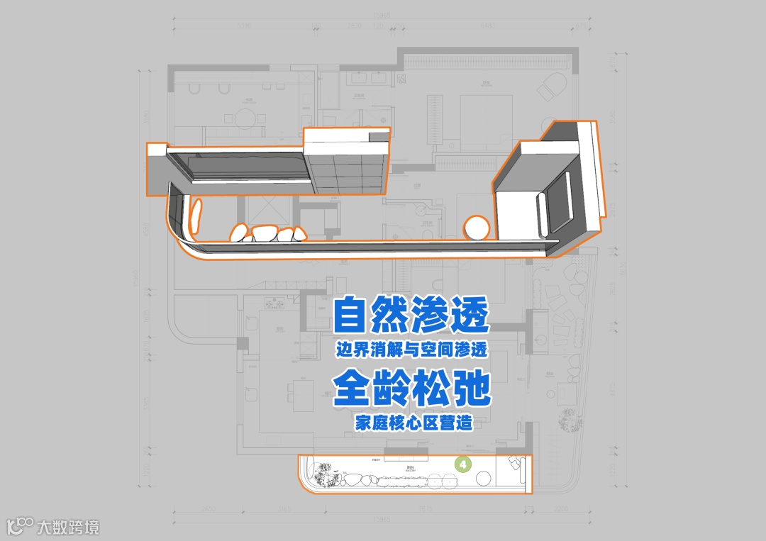 解析4▶西向阳台以绿植景观带为自然边界,柔化空间动线。L 型垂直转角处设沙发榻,午后暖阳洒落,静坐其间,尽览窗外景致,身心皆安。通透设计让客厅与阳台无缝衔接,绿意与天光自由渗透,三代同堂的日常,随时可在此邂逅自然与松弛。