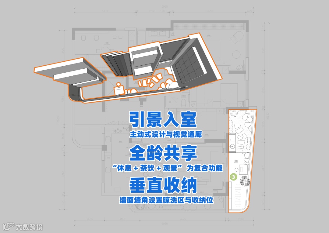 解析3▶不封阳台,以全景落地窗引清风与天光入室,青石板铺地,自带自然肌理与温润质感。一隅设盥洗盆,满足洗晾与浇花需求,衣物晾晒于墙角,不遮挡客厅视线。余下空间打造休息区,绿植环绕,三代人闲坐于此,喝茶观景,在烟火日常里尽享松弛的自然意趣。