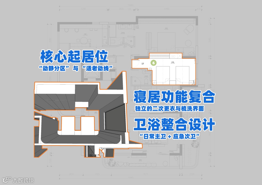 本项目为三代同堂常住的一梯一户住宅,核心需兼顾长辈适老、高中子女成长,以及男女主人高效居家办公的核心需求。老人房保留双床设计,适配长辈长期居住的舒适与安全;儿童房贴合高中生独立学习与生活节奏,预留充足的学习与储物空间。男女主人的独立工作室是本次设计重点,需紧邻主卧布局,打造便捷的办公动线。工作室需配备独立水点与简餐区,构建 “办公 + 轻食” 一体化功能体系,满足二人同步办公、临时简餐、灵感碰撞的多元需求,让居家办公更具效率与温度。主卧卫生间需配齐马桶、淋浴、洗手台盆等四件套,主卧室重点扩容衣物收纳空间,打造整洁有序的私域。厨房采用中西厨分离布局,兼顾中式烹饪的烟火气与西式轻食的便捷性,提升日常使用实用性;入户门厅改造为专属收纳区,解决全家杂物与鞋履的储物需求。阳台采用分段式设计,兼顾景观观赏、休闲互动与情调营造,让居家办公与生活烟火和谐共生。