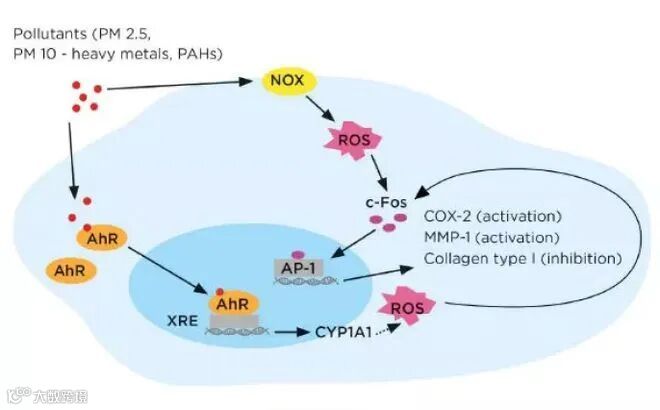 其次,这些“小偷”还会激活皮肤里的一个“警报器”,这个警报器叫做“AhR受体”。一旦警报器被激活,它就会发出指令,让皮肤产生更多的“自由基”,以及一些“炎症因子”和“胶原蛋白分解酶”。