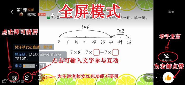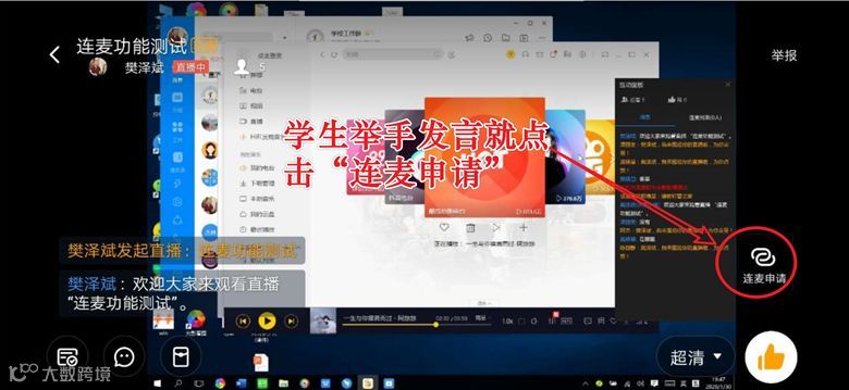 连麦申请相当于学生举手发言,它在手机端全屏画面中才能显示。