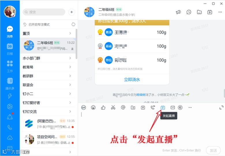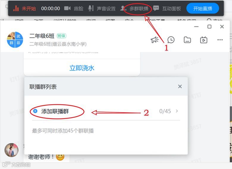 进入钉钉班级群,点击“发起直播”。如有多个任教班级可先选择其中的一个,其他班级运用“多群联播”一起加入直播上课。
