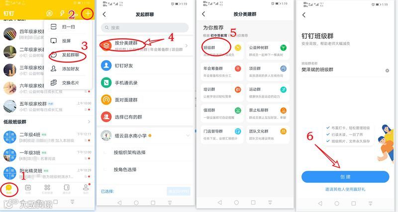 如果学校已经开通了钉钉“家校通讯录”,那么老师只要进入自己所在的钉钉班级群看看还有哪些学生未加入,也可多邀请学生家长捆绑到学生上,以备妈妈的手机不能用,还可以用爸爸的。如果自己的学校还没有开通钉钉“家校通讯录”,那么老师可以自己组建一个钉钉班级群,点击“消息”——右上角“+”——“发起群聊”——“按分类建群”——“班级群”