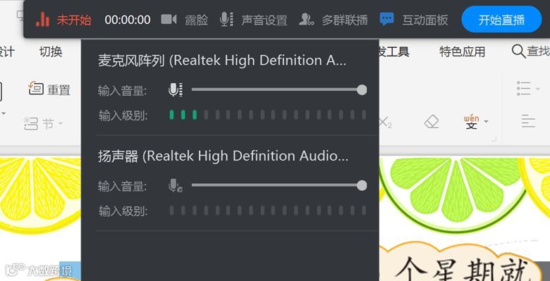 5.声音设置。一般默认即可,不用去设置,如果直播时没有声音可以点击进行设置检查。