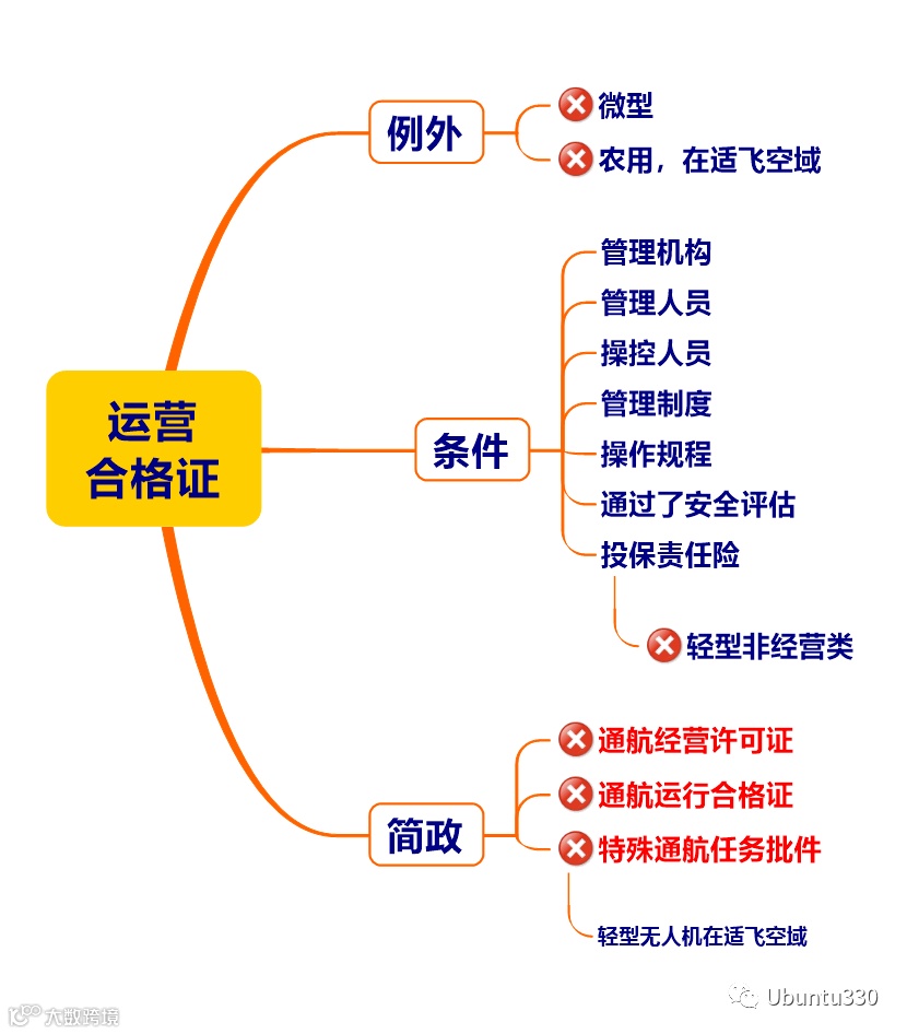 无人机运营企业只需要办理一个证:运营合格证,比通航企业来的简单。通航经营许可和运行合格证都不再需要;轻型无人机在适飞空域也不再需要任务批件(因为无人机都带摄像头,这一条解决了大量不经意的对地成像违法问题)。