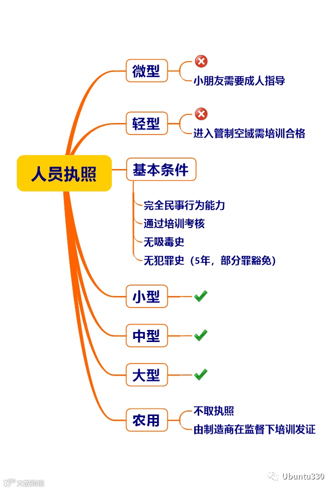 人员执照管理的初衷是减少公众的风险,而微轻型无人机和农用无人机在正常情况下对公众风险都很小,因此无需执照管理;行业应用的技能水平,是不需要执照管理的,或者说不需要政府管理,就像政府会管餐厅的卫生,而不会去管味道。