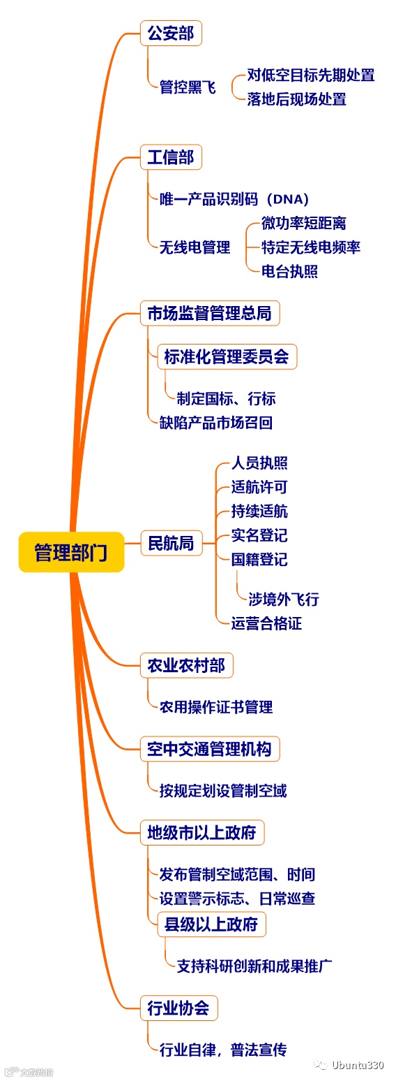无人机的管理部门看上去很多,但守法用户主要关注民航局和市政府即可,其余的均和制造(工信部、标委、市场监督局、县政府)有关,或者后台协同(农业部、空管委);不守法的公安部伺候。