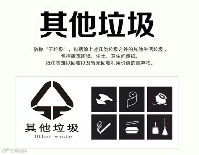 其他垃圾:危害较小,但无再次利用价值,如建筑垃圾类,生活垃圾类等,一般采取填埋、焚烧、卫生分解等方法,部分还可以使用生物解决,如放蚯蚓等。是可回收垃圾、厨余垃圾、有害垃圾剩余下来的一种垃圾。