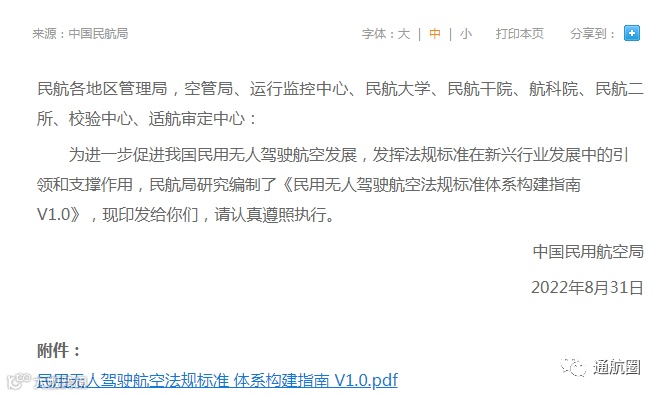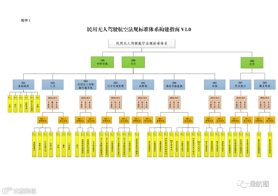 近期,民航局网站公布《民用无人驾驶航空法规标准体系构建指南V1.0》和《民用轻小型无人驾驶航空器物流配送试运行审定指南》。其中,《民用无人驾驶航空法规标准体系构建指南V1.0》在《中华人民共和国民用航空法》的统领下,依据无人驾驶航空 器管理有关法规,按照民航局对民用无人驾驶航空法规标准体系构建 的总体思路,采用“1+N+X”的管理模式。“1”即1 部规章,“N”即N 份规范性文件及政策文件,“X”即X 份技术标准。体系划分与民用无人驾驶航空活动管理链条及系统风险类别相匹配。