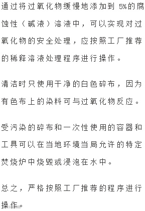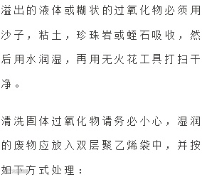 有机过氧化物必须被销毁,若将它们丢弃或倒入下水道,会引起着火或爆炸。