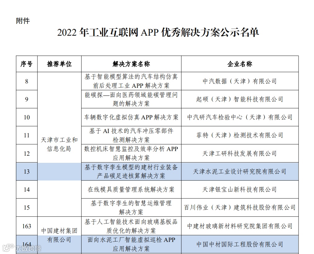 近日,工业和信息化部公布了2022年工业互联网APP优秀解决方案名单,中国建材股份所属中材国际的“面向水泥工厂智能虚拟巡检APP应用解决方案、天津水泥院的“基于数字孪生模型的建材行业装备产品碳足迹核算解决方案”入选该名单。