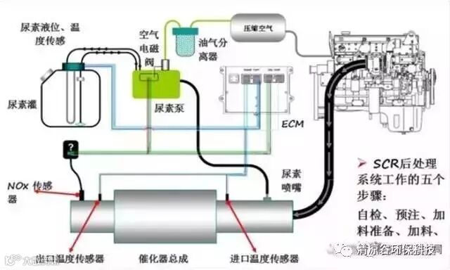 车用尿素SCR系统主要包括:尿素水溶液储罐、输送装置、计量装置、喷射装置、催化器以及温度和排气传感器等。