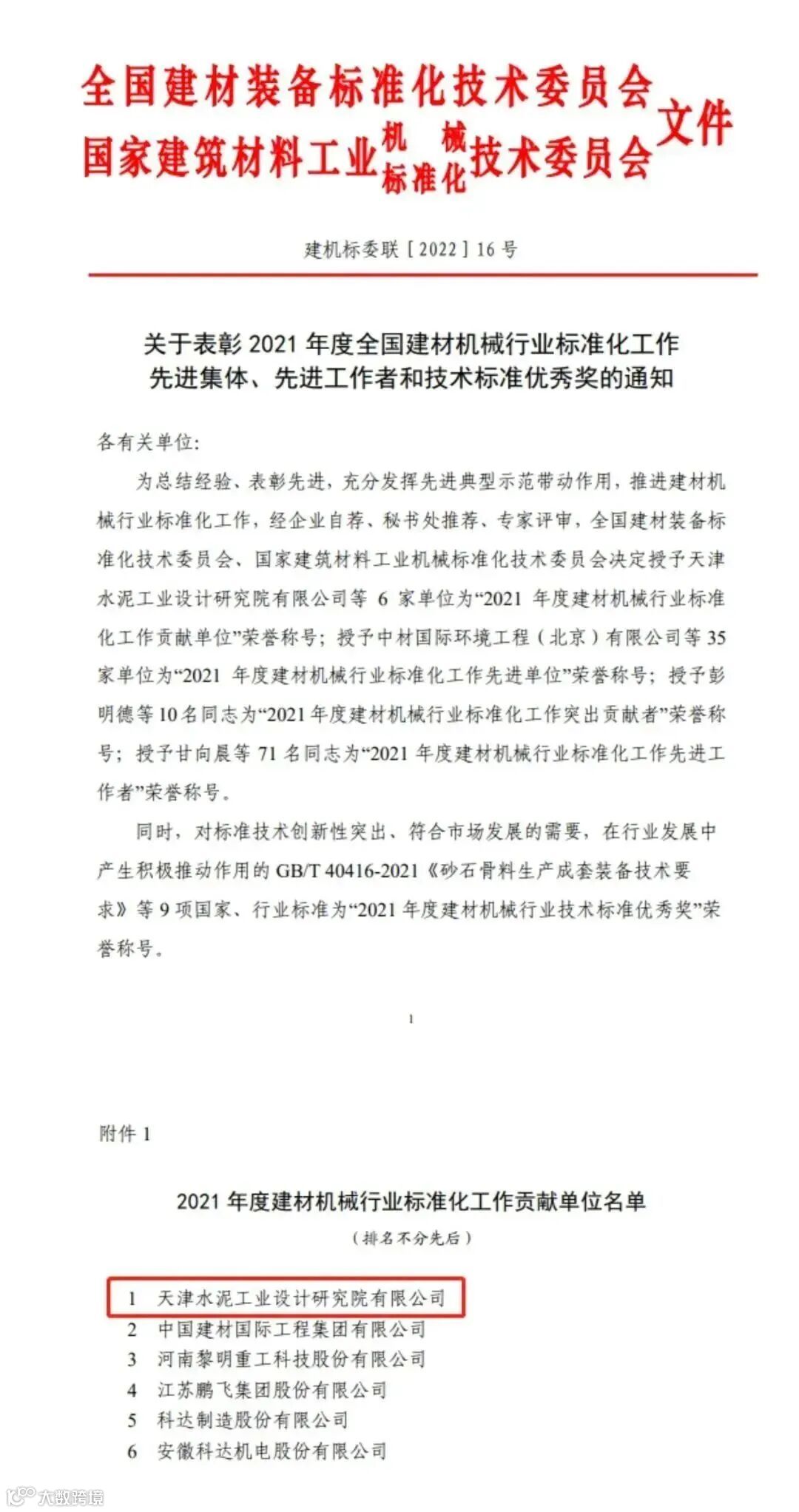 近日,2022年建材机械行业标准化工作会议顺利召开,会上表彰了2021年度全国建材机械行业标准化工作先进集体、先进工作者和技术标准优秀奖。天津水泥院荣获2021年度建材机械行业标准化工作贡献单位,公司主编国家标准《砂石骨料生产成套装备技术要求》(GB/T 40416-2021)荣获2021年度建材机械行业技术标准优秀奖,7名同志分获2021年度建材机械行业标准化工作突出贡献者、先进工作者荣誉称号。