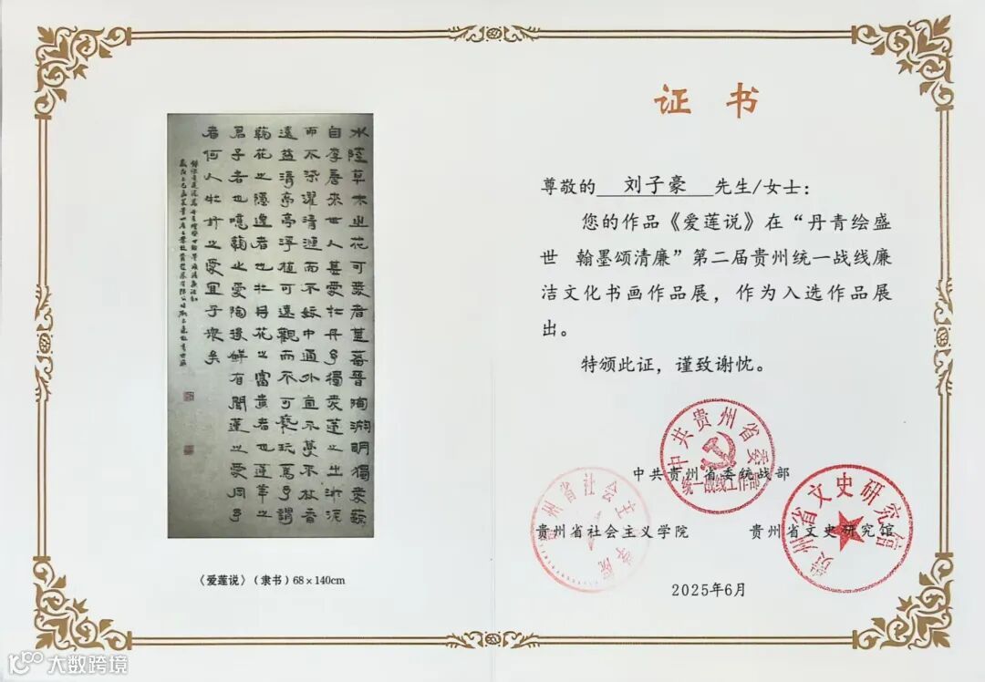 6月26日,由中共贵州省委统战部、贵州省社会主义学院和贵州省文史馆联合主办的“丹青绘盛世·翰墨颂清廉”贵州统一战线第二届廉洁文化书画作品展,在贵州省社会主义学院开展。经评审甄选,筛选,工投公司投资部副经理刘子豪书画作品《爱莲说》入选“丹青绘盛世·翰墨颂清廉”第二届贵州统一战线廉洁文化书画作品展。
