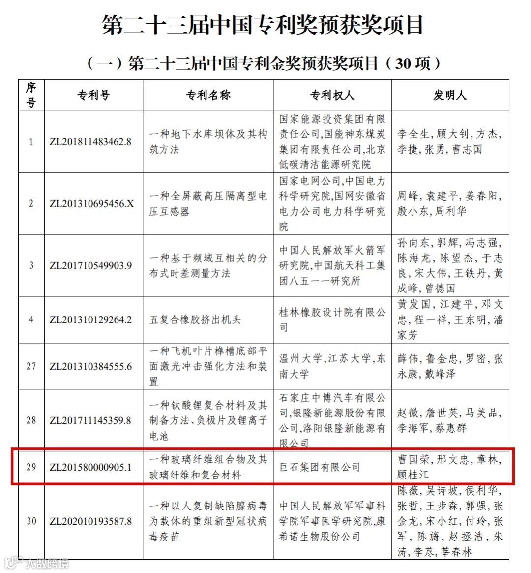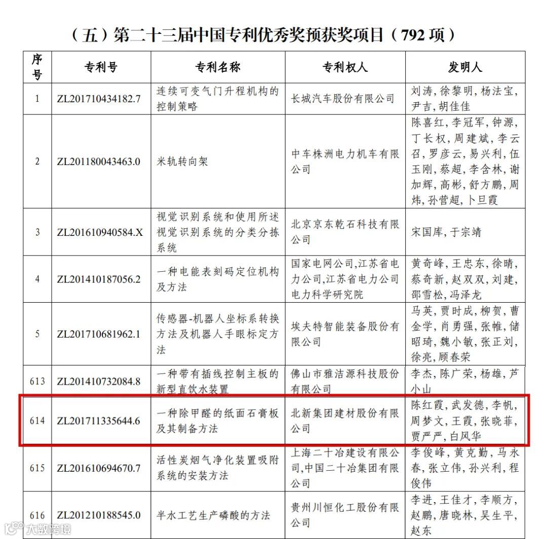 近日,第二十三届中国专利奖获奖名单出炉,中国建材股份有限公司所属巨石集团有限公司荣获中国专利金奖(专利名称:一种玻璃纤维组合物及其玻璃纤维和复合材料);北新集团建材股份有限公司获中国专利优秀奖(专利名称:一种除甲醛的纸面石膏板及其制备方法)。