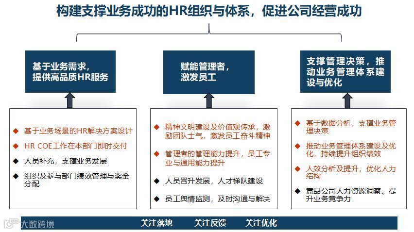 对HRBP而言,他们最终的目的都是服务于业务。因此他们不能够仅仅专注于HR领域,更要参与到业务之中,将业务需求转化为HR需求,再提出解决方案。