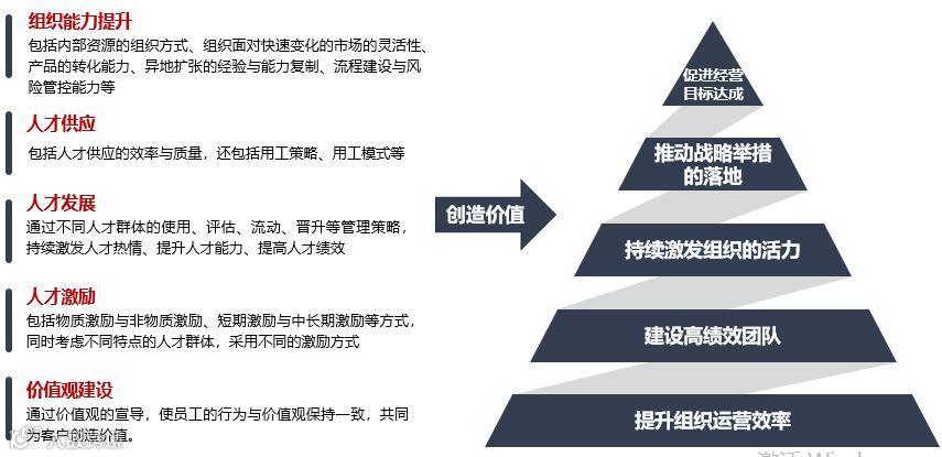 HRBP团队可以从组织能力提升、人才供应、人才发展、人才激励和价值观建设这五个方面为业务团队提供价值。通过对着五个方面的优化提升,达到提升组织运营效率、建设高绩效团队、持续激发组织的活力、推动战略举措的落地以及促进经营目标达成的效果。