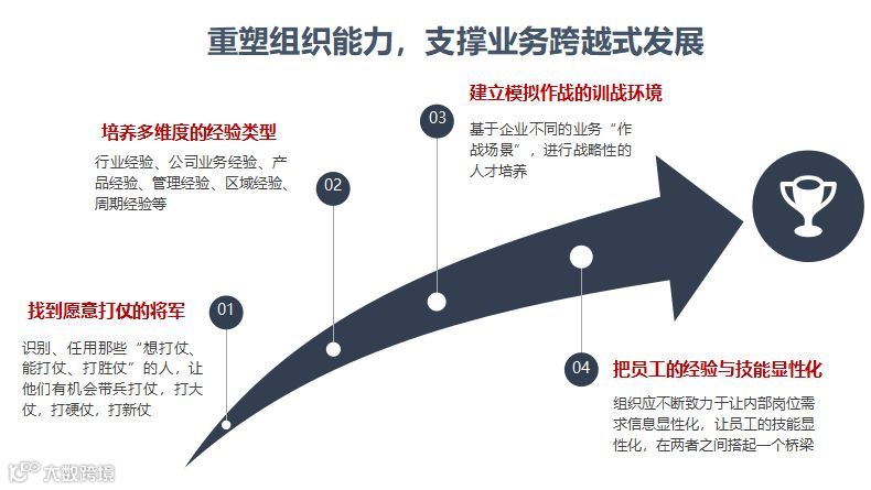 对于原有业务的升级与跨越式发展,首先要挖掘出一批有冲劲、愿意开拓的“将军”;其次要培养干部与员工多维度的经验类型,具体可通过建立模拟作战的训战环境;把员工的经验与技能显性化,在岗位需求与员工发展之间搭起桥梁。