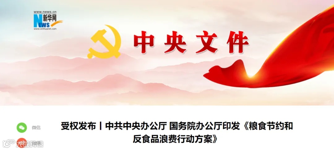 近日,中共中央办公厅、国务院办公厅印发了《粮食节约和反食品浪费行动方案》,并发出通知,要求各地区各部门结合实际认真贯彻落实。