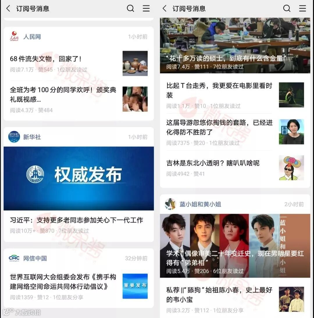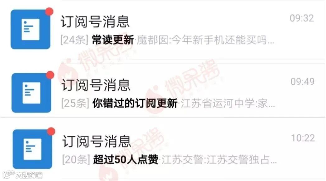 近日,微信订阅号消息列表收到“经常阅读更新”、“订阅更新你错过了”、“50多人喜欢”和明星微信官方账号等强烈提醒,标题均以黑体字显示。