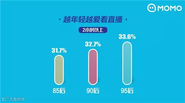 越年轻用户,观看直播时间越长。32.7%的90后每天看直播>2小时,95后这一比例为33.6%。