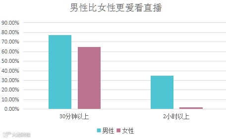 男性比女性更爱看直播,77.3%的男性看直播>30分钟/天,>2小时的约35.1%;女性用户>30分钟/天的比例为64.6%,>2小时为20.3%。
