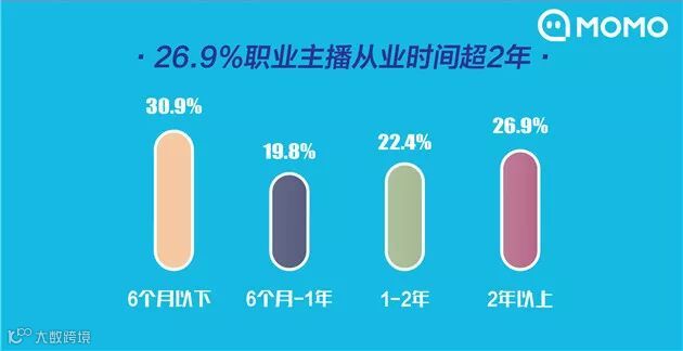 受访主播中,超过2成的主播从业时间>2年,26.9%职业主播直播时间>2年。