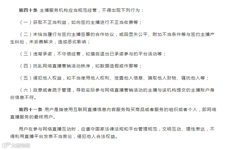 原文共6章44条,其中11条规范主播,8条规范网络主播平台,7条规范商家,3条规范mcn,1条规范消费者。
