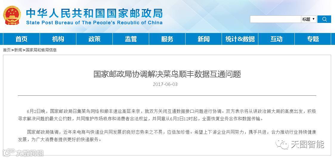 据国家邮政局网站消息,6月2日晚,国家邮政局召集菜鸟网络和顺丰速运高层来京,就双方关闭互通数据接口问题进行协调。双方同意从6月3日12时起,全面恢复业务合作和数据传输。